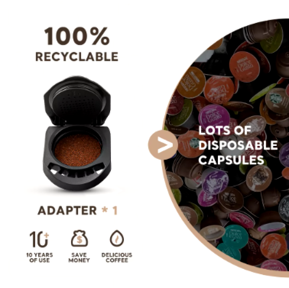 - محول كبسولة قهوة قابل لإعادة الاستخدام، مما يوفر المال ويحمي البيئة.